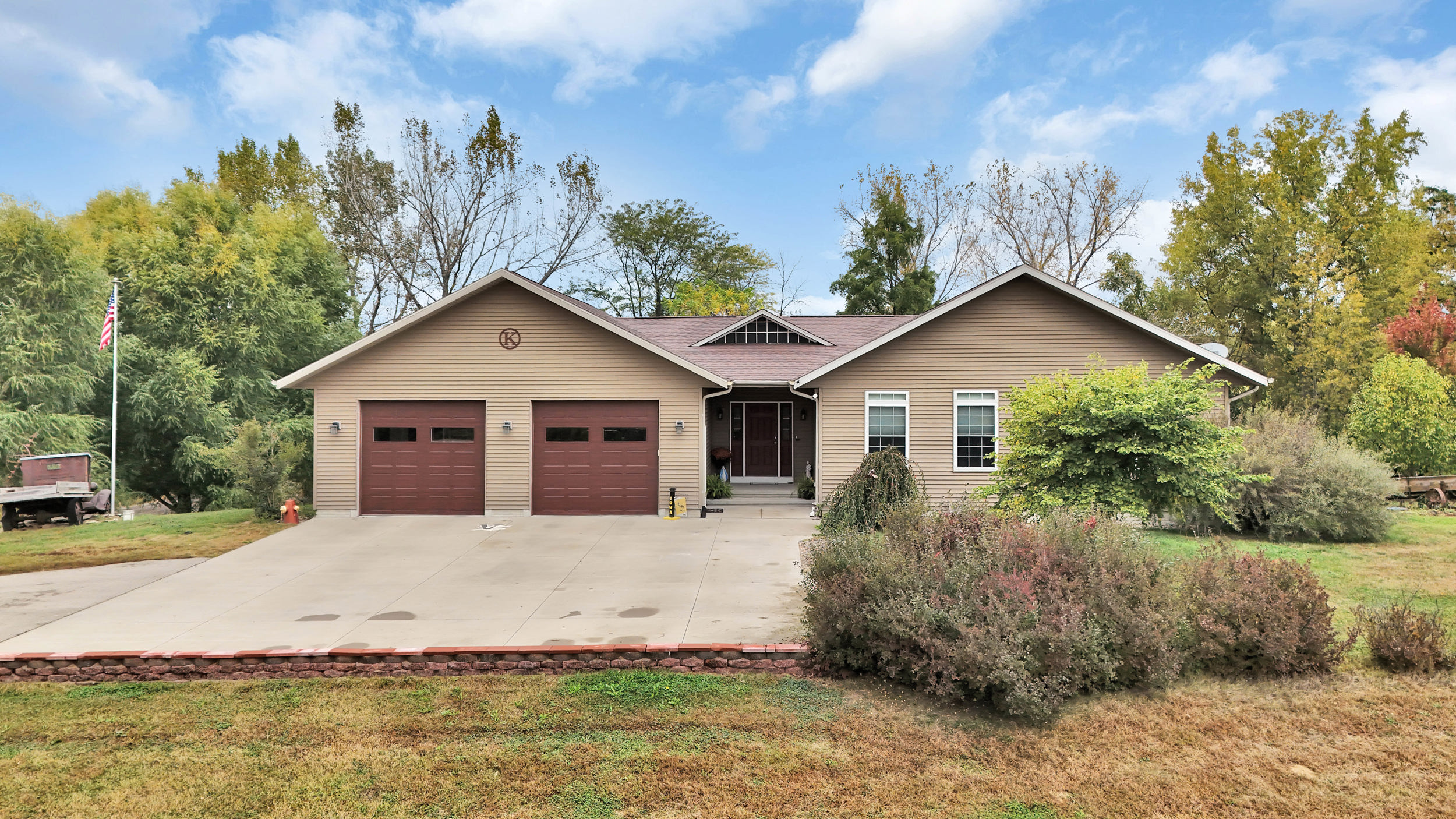 Discover peaceful country living just off a hard-surfaced road on this beautifully maintained 1.79 acre property. Built only 12 years ago, this 2,474 sq ft home features a comfortable floor plan with geothermal heating and a spacious walk-in pantry. The oversized heated and cooled 2-stall garage is a showstopper – equipped with in-floor radiant heat, a heat/cool mini split, in-floor drain, soft water spigot and a dedicated man cave area, ideal for hobbies or gatherings. Step outside to your private backyard oasis complete with a hot tub, charming gazebo, dry creek feature, and arched bridge – the perfect place to relax or entertain. Need space for equipment or an RV? The 22×46 machine shed offers 50-amp power and endless possibilities for shop use or storage. A rare blend of efficiency, comfort and country charm – this property has it all!